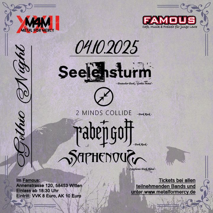 Am 04.10.2025 spielen wir auf der Gothic Night vom Metal For Mercy e.V. im Famous in Witten. Tragt euch den Termin schon mal im Kalender ein! Der Vorverkauf startet circa 6-8 Wochen vorher. In den kommenden Wochen gibt es weitere Details zur Veranstaltung.